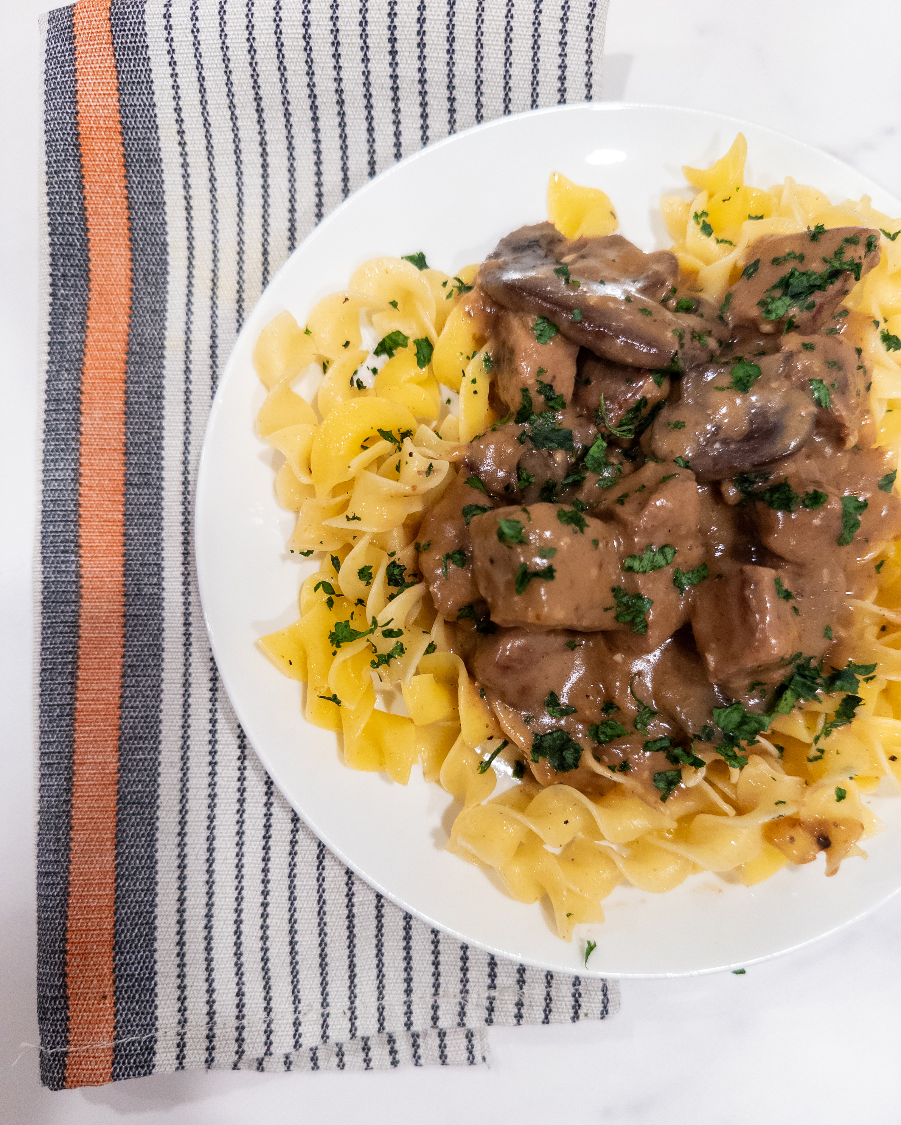 Serve your stroganoff over your favorite base, whether it’s egg noodles, mashed potatoes, or rice, and garnish with fresh parsley for a pop of color.