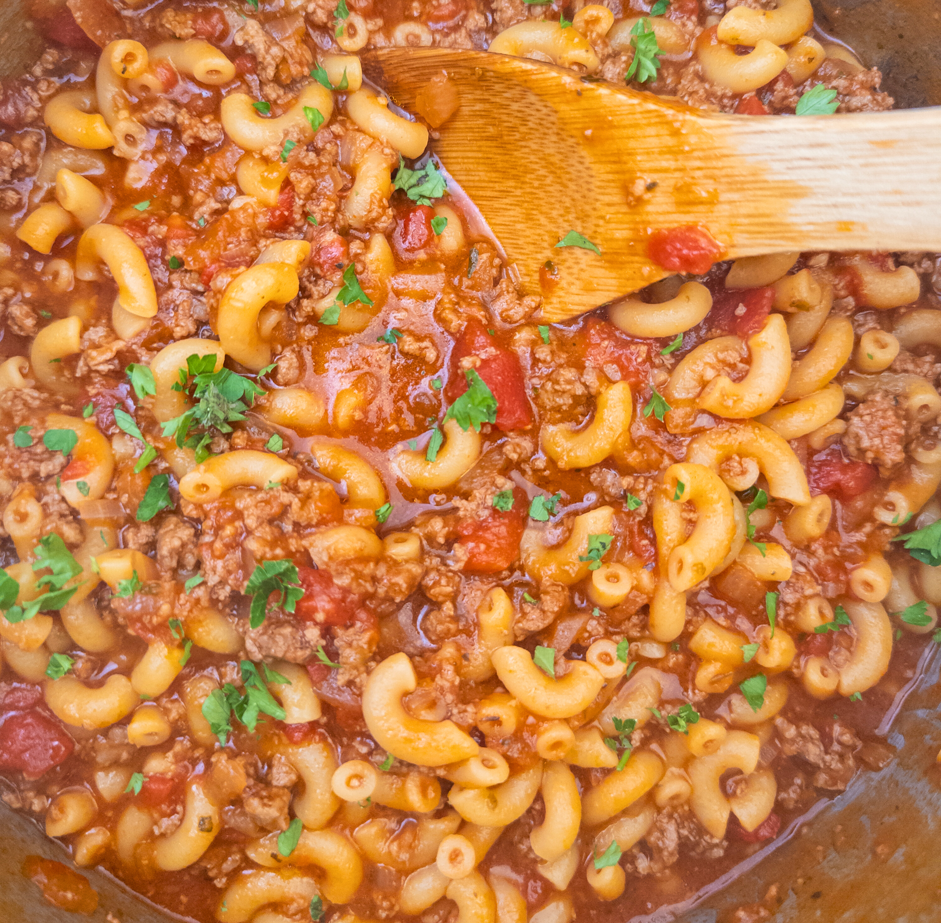 A hearty one-pot American goulash with ground beef, elbow macaroni, and tomato sauce — an easy, comforting main dish for family dinners.