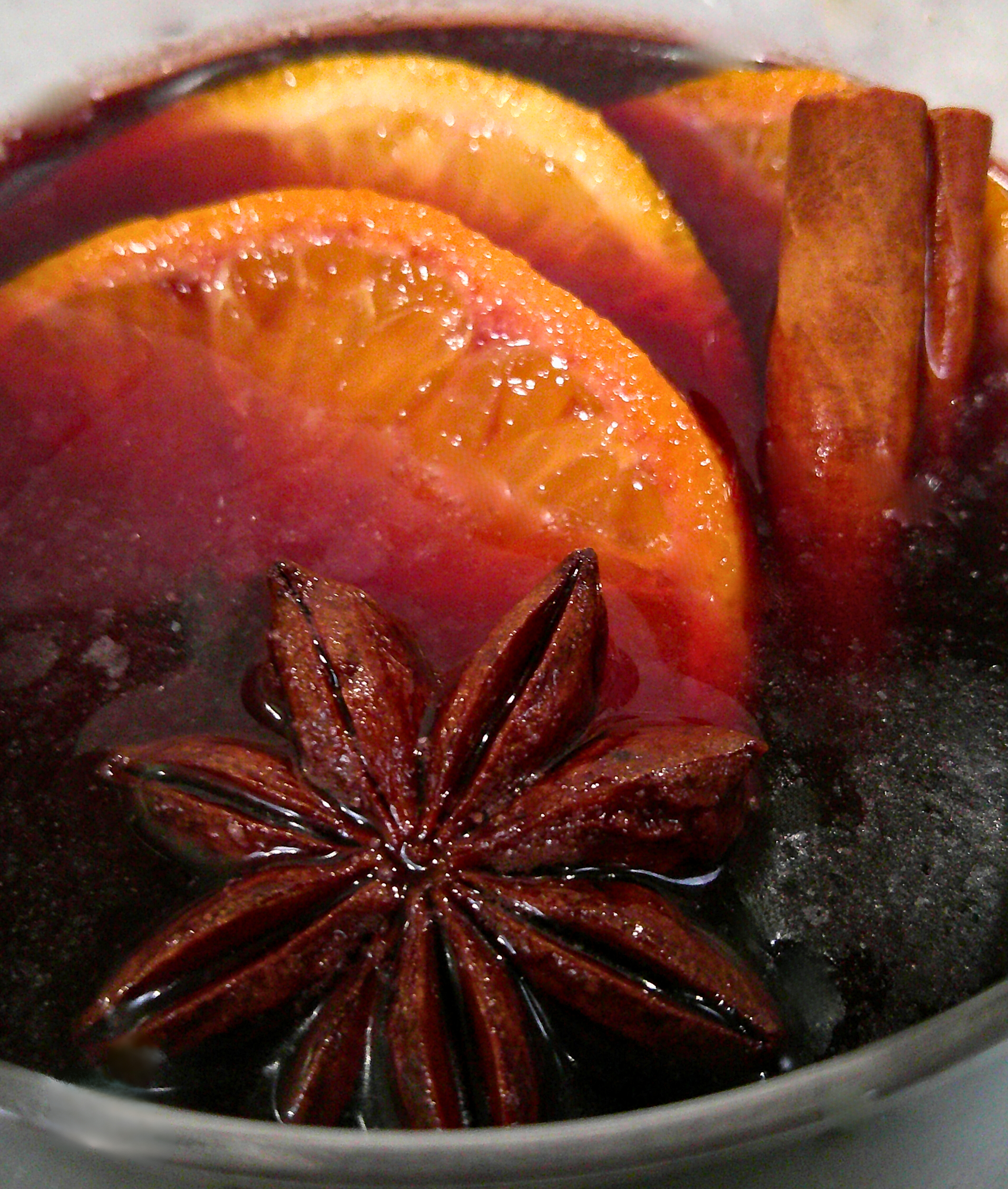 Add the orange slices, cinnamon sticks, cloves, and star anise.